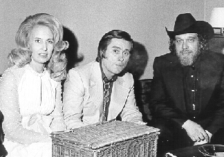 I would feel remiss if I did not take this opportunity to pay tribute to the late Tammy Wynette, who helped me introduce live country music to New York's Lincoln Center and to Manhattan in 1973. Photographed by Anthony de Nonno, here she is, sitting backstage in an Avery Fisher Hall (Wasn't it called Philharmonic Hall back then?) dressing room with her singing partner, the legendary George Jones, and with a beStetsoned yours truly prior to the first of my Country In New York concert series. ##