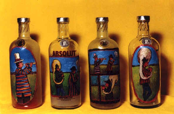 Besides Matisse, he has been largely influenced by Van Gogh, Picasso, and the American and British Pop Art of the 1960's. His work has been exhibited in The Museum of Modern Art, The Smithsonian, The Brooklyn Museum, The Los Angeles County Museum, and The Santa Monica Museum of Art. He has had many exhibitions at New York University and at galleries throughout the country. He is represented in Europe by Joanne Eder who can be emailed at anamericaninparis@wanadoo.fr. The following painted vodka bottles are more examples of Ed’s work:
