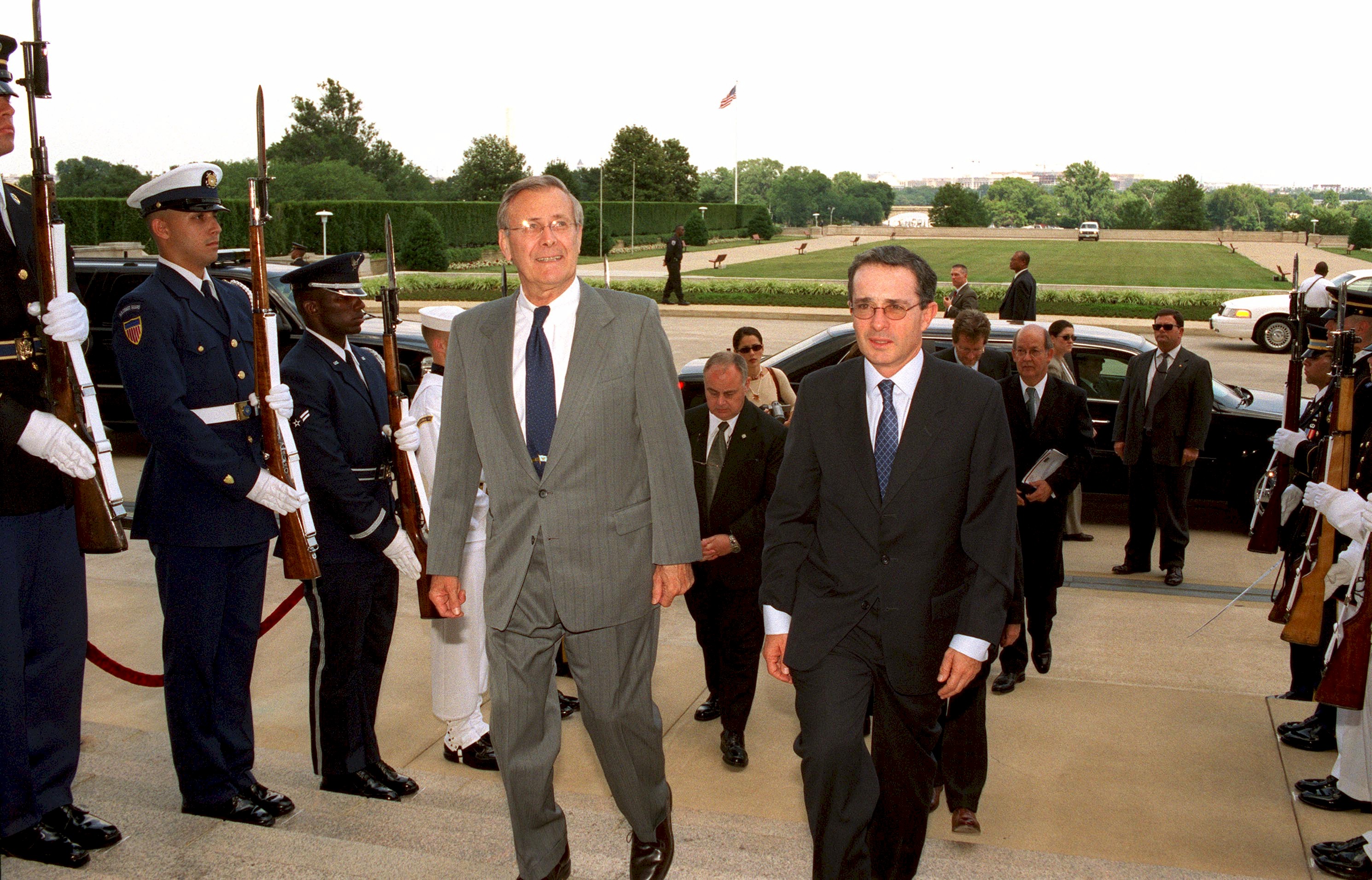DEFENSE SECRETARY RUMSFELD ESCORTS PRESIDENT URIBE INTO PENTAGON